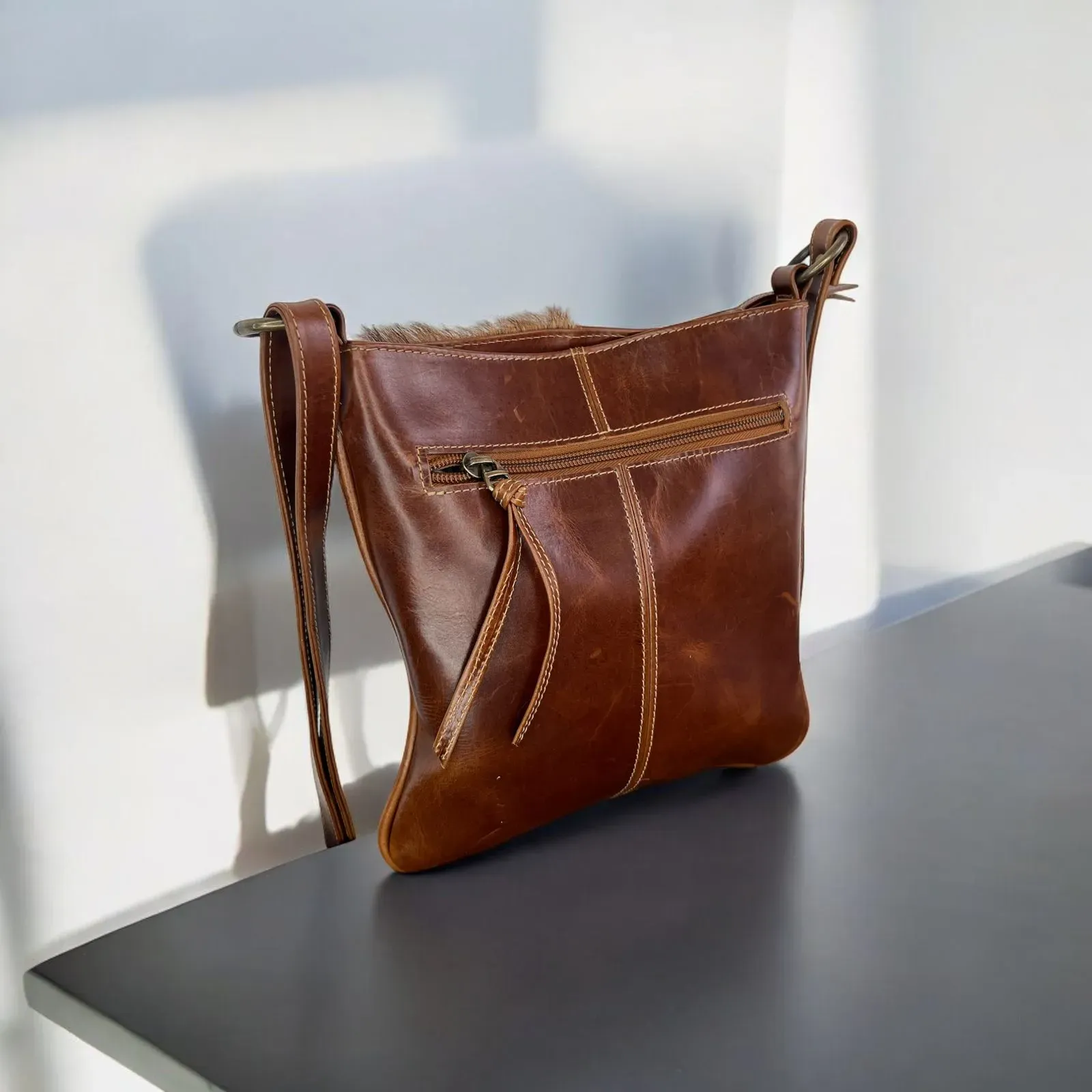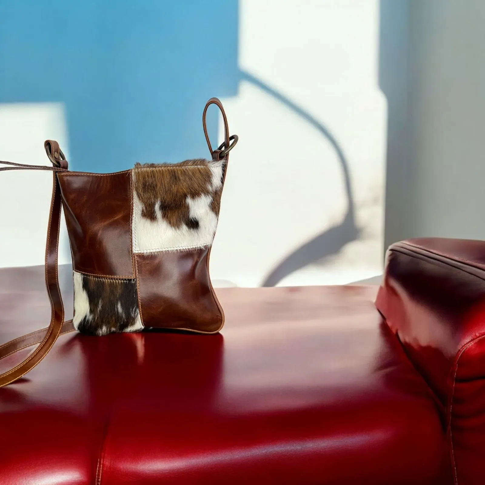 Un bolso en cuero genuino con detalles en pelo presenta un diseño elegante y moderno. La base y la estructura principal del bolso están hechas de cuero de alta calidad, con un acabado liso y brillante. En la parte frontal, se destacan dos cuadros cubiertos de pelo suave que aportan un contraste inte...